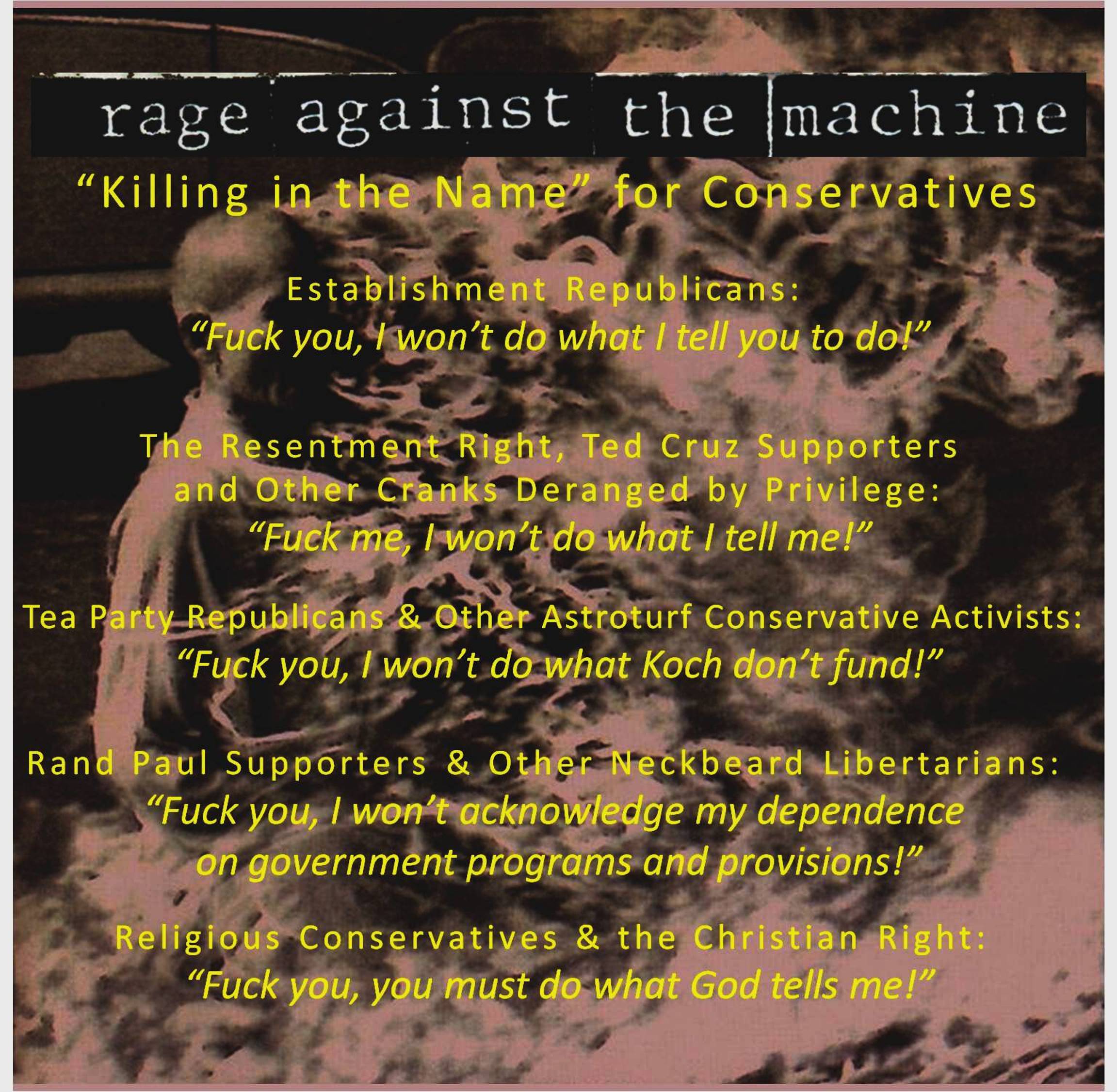 “Fuck you I won’t do what you tell me” is a truth-to-power declaration of independence. A battle cry against injustice. White teabaggers toting open-carry permitted pistols and long guns from their fully loaded Ram pickups to the local DQ talk shit about being mad as hell. (About what, asshole?)